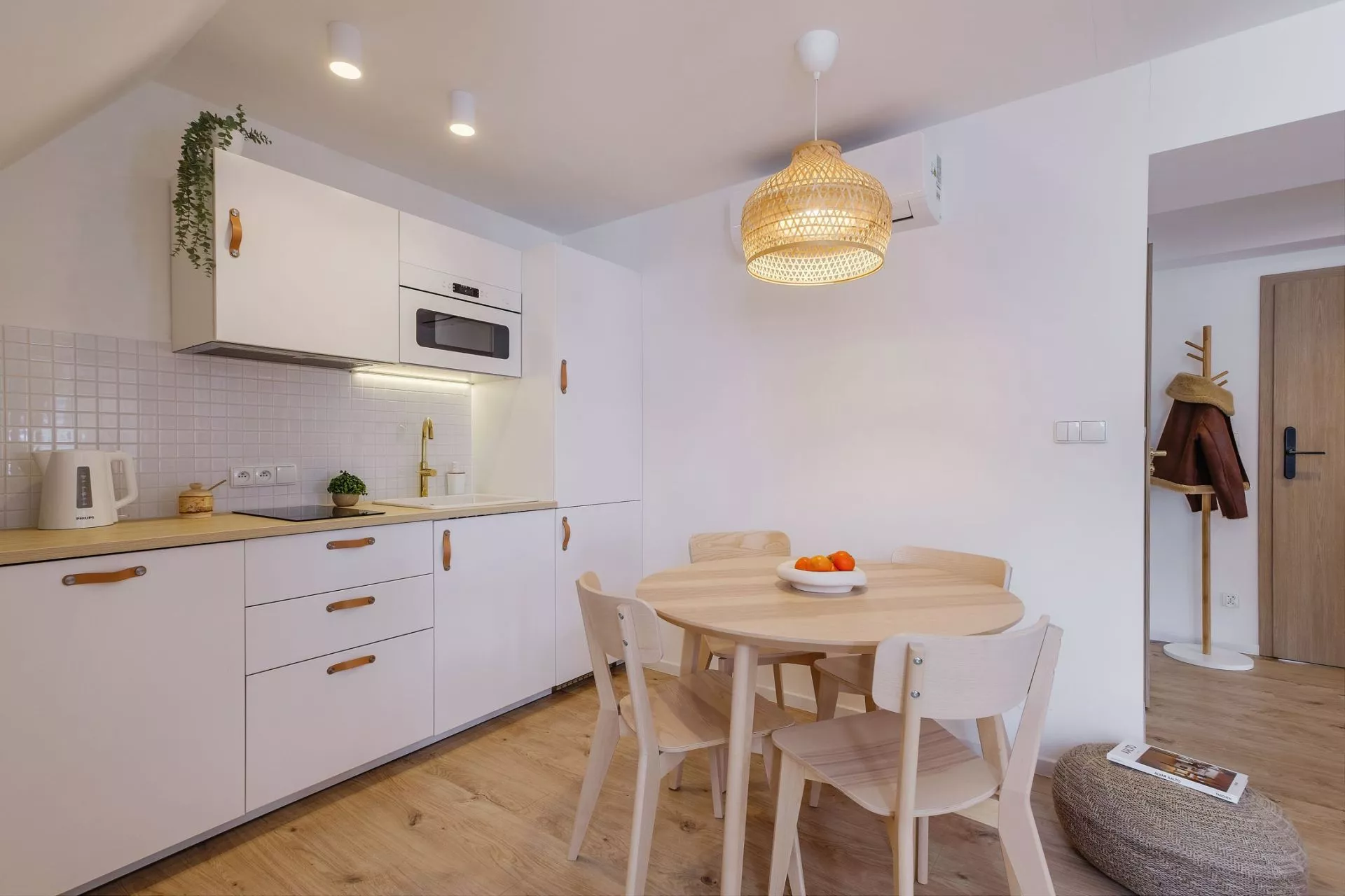 Aneks kuchenny: 2 palnikowa płyta elektryczna, duża lodówka, zmywarka, kuchenka mikrofalowa, czajnik elektryczny, ekspres do kawy, naczynia, sztućce, zastawa szklana