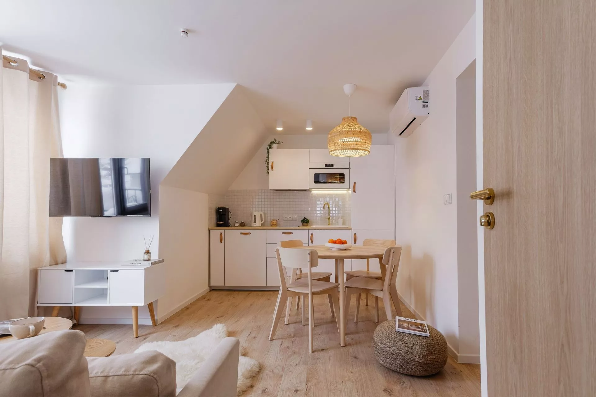 Salon: sofa, stół, 2 krzesła, klimatyzacja, wanna