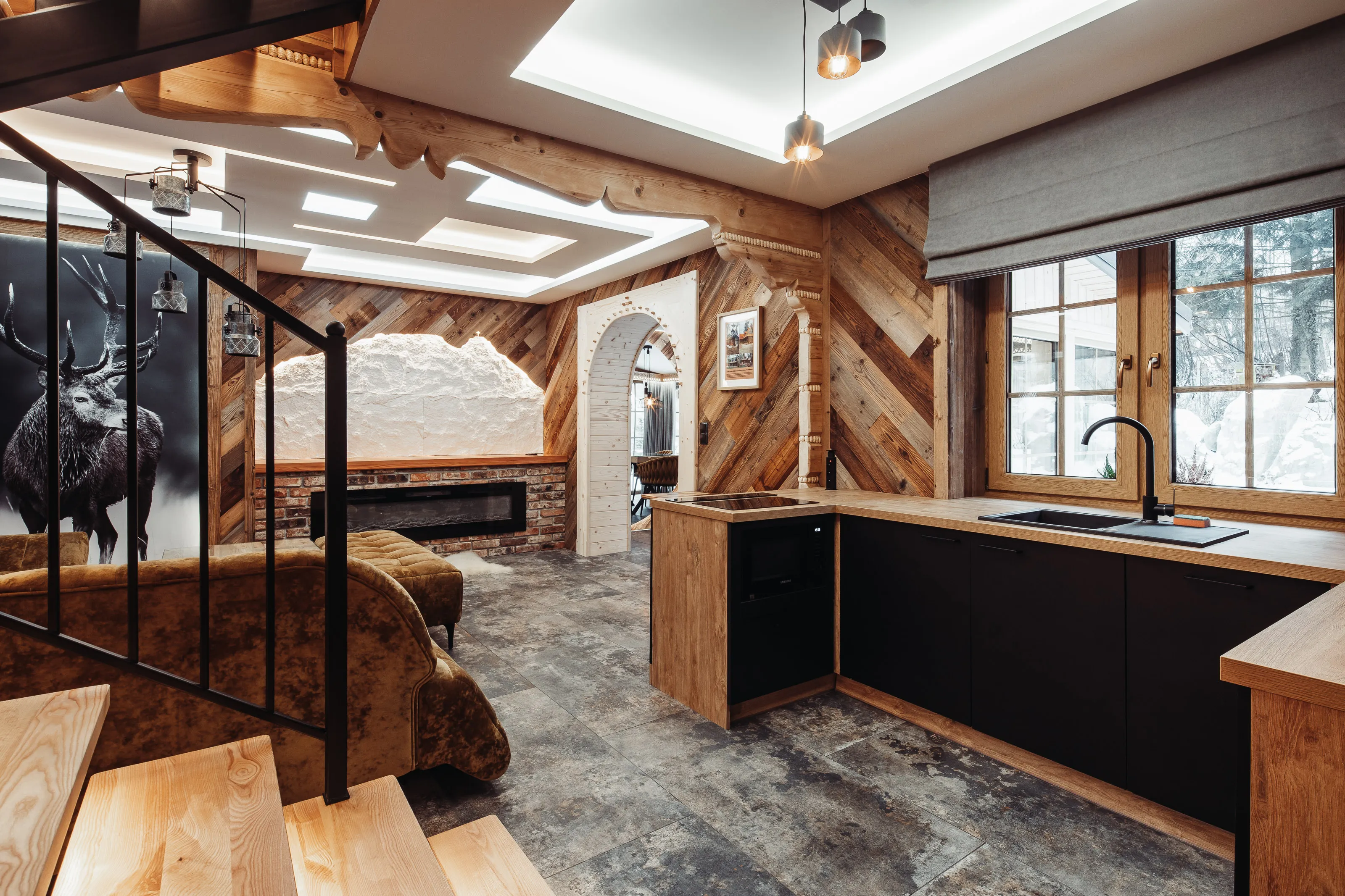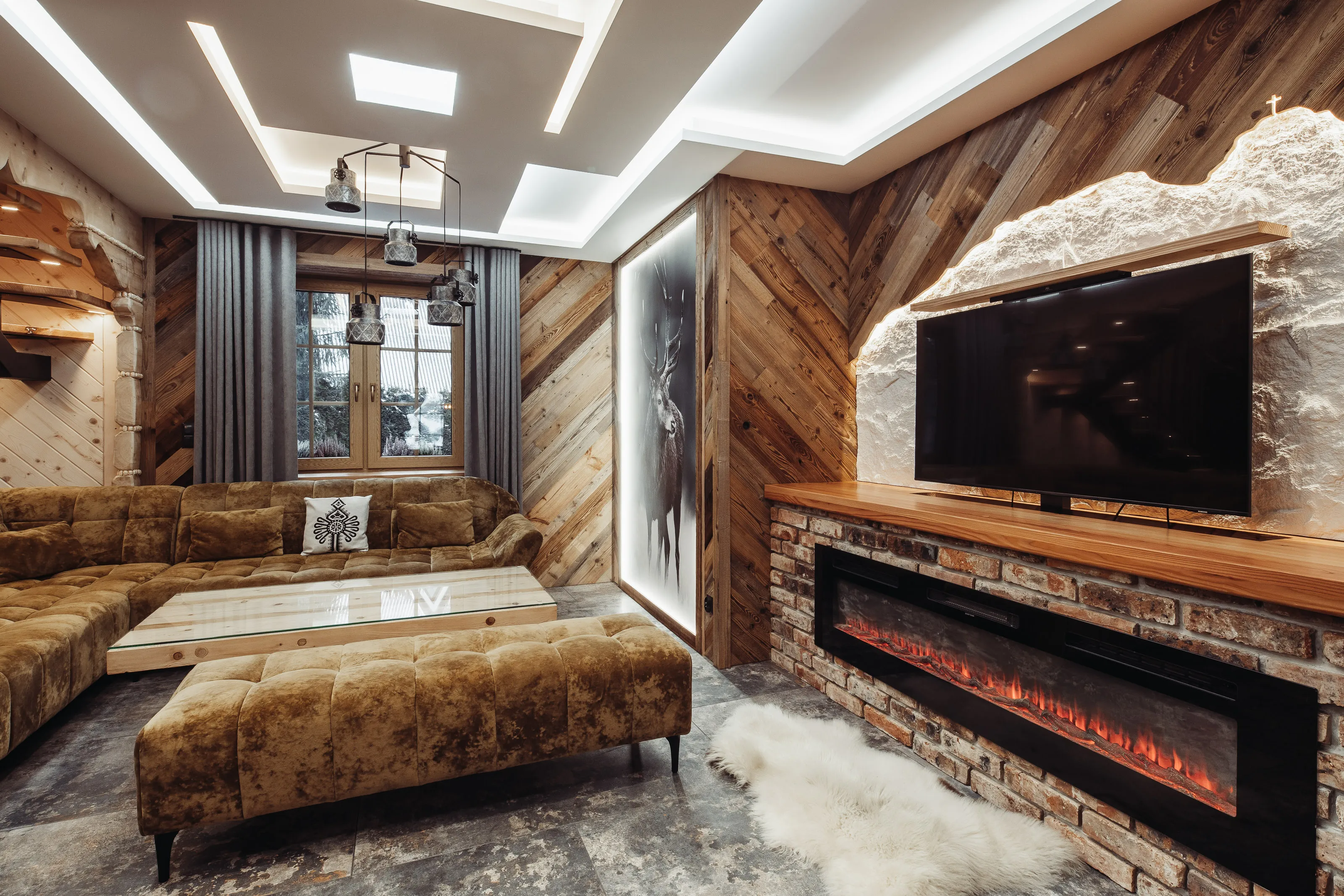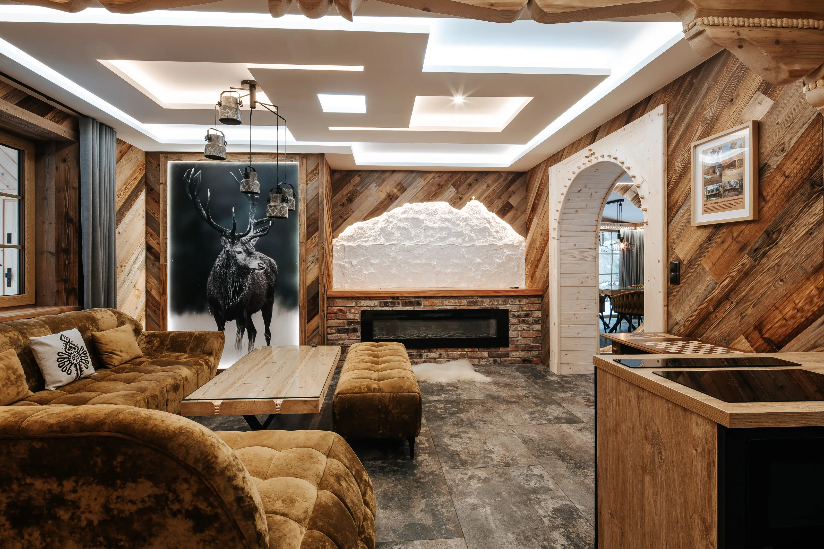 Salon: duży (nie rozkładany - bez funkcji spania) narożnik wypoczynkowy, puffa, stolik, TV LCD 45' (automatycznie wysuwany), kominek elektryczny. W części jadalnianej - duży stół + 6 foteli