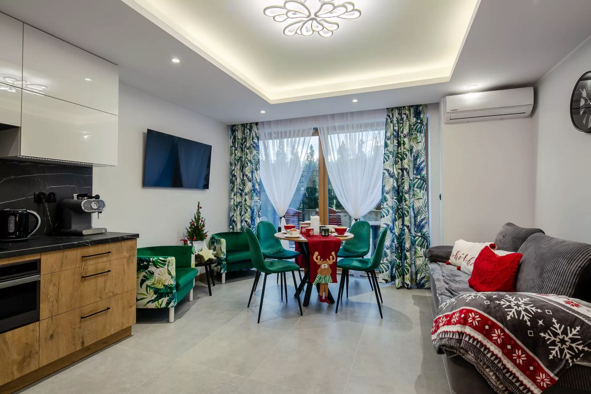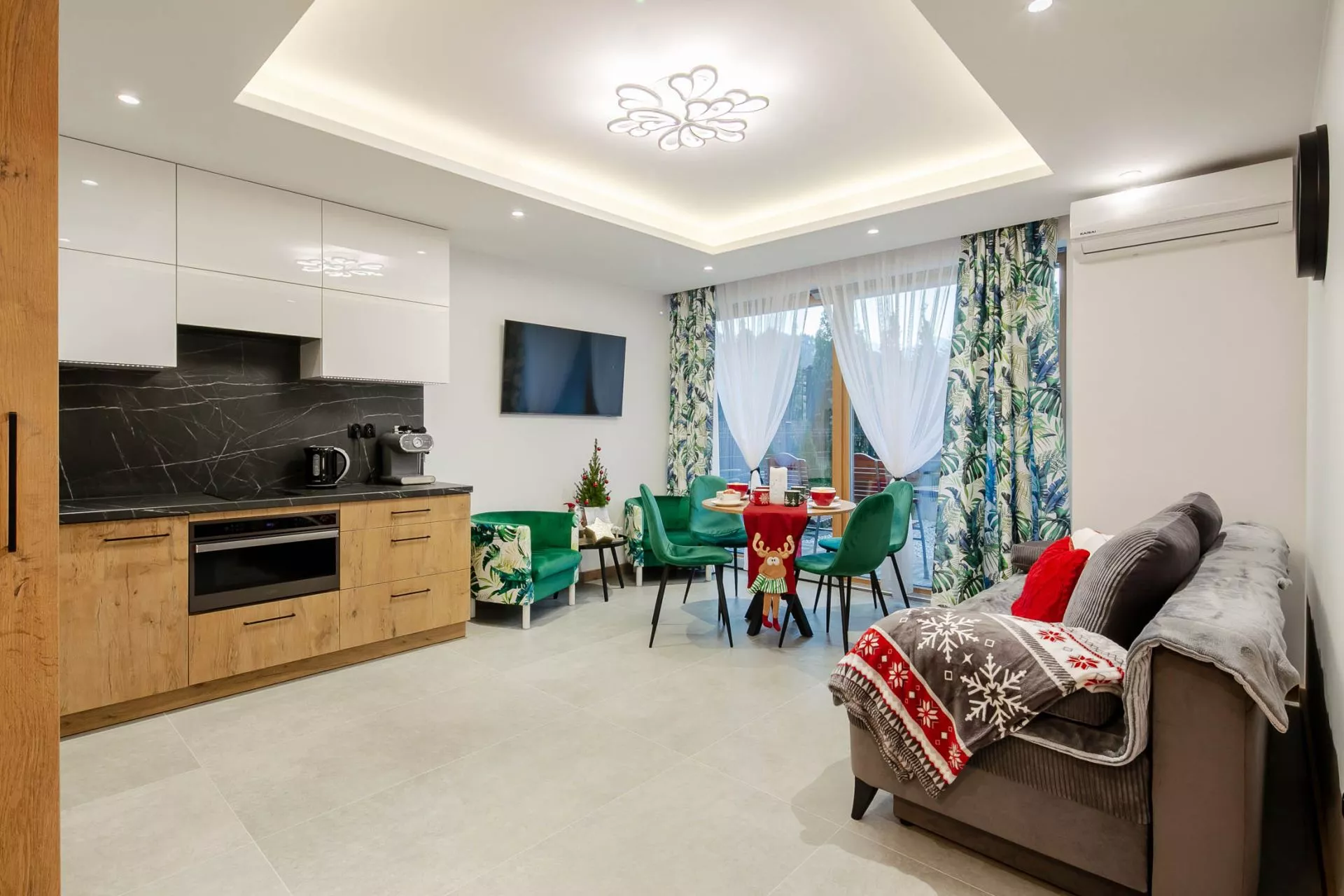 Salon: 2 osobowa sofa, duży okrągły stół, 4 krzesła, 2 fotele, stolik kawowy, TV'43, klimatyzacja. Z salonu znajduje się bezpośredni wyjście do prywatnego ogródka.