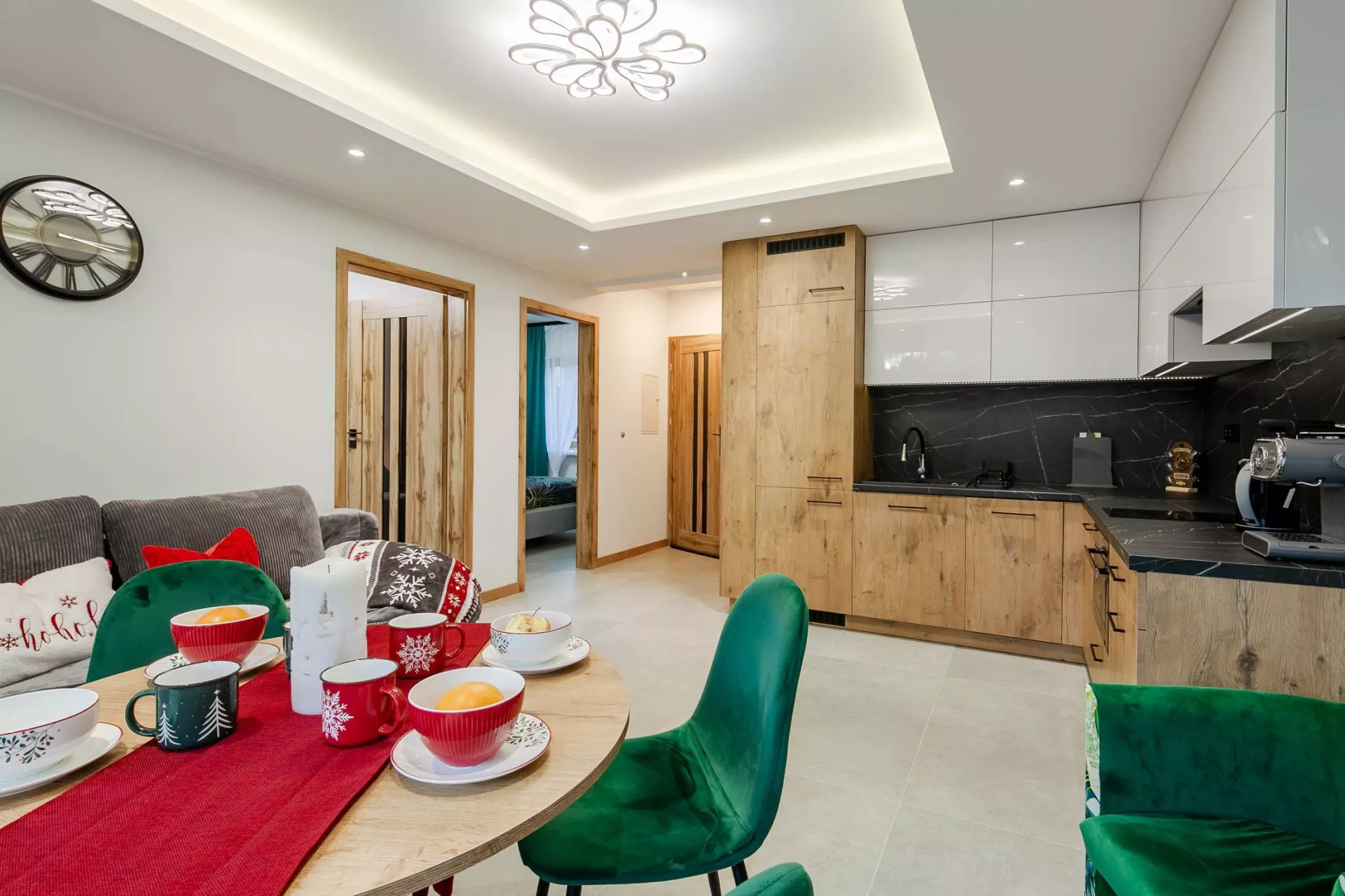 Aneks kuchenny: duża lodówka, zamrażarka, zmywarka, płyta grzewcza 2 palnikowa, czajnik elektryczny, ekspres do kawy, kuchenka mikrofalowa, komplet naczyń, garnków, sztućców, zastawa szklana.