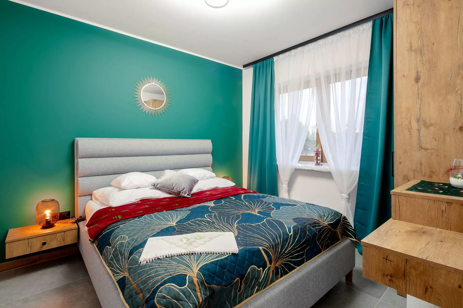 Sypialnia 1 - łóżko małżeńskie, szafa, wyjście do prywatnego ogródka