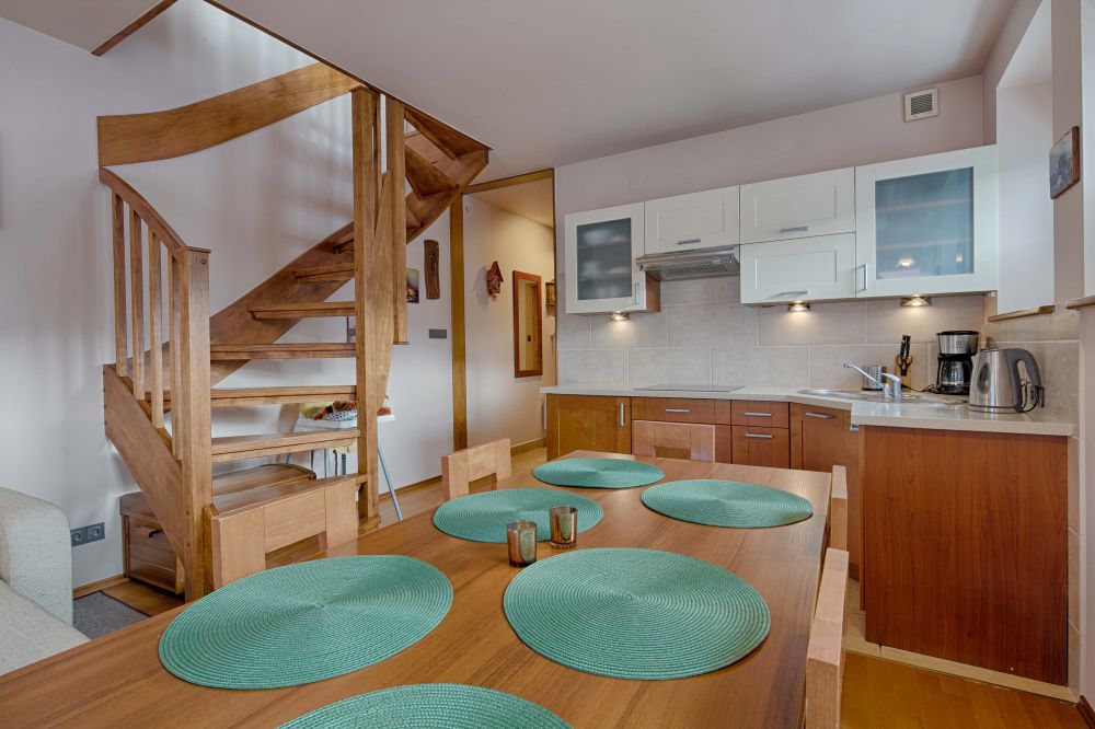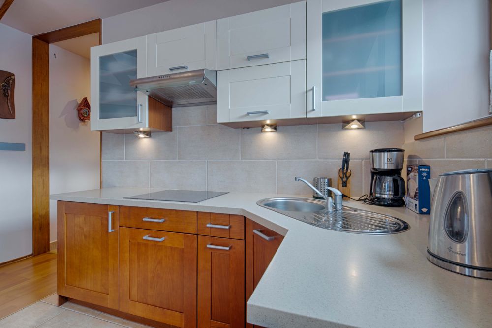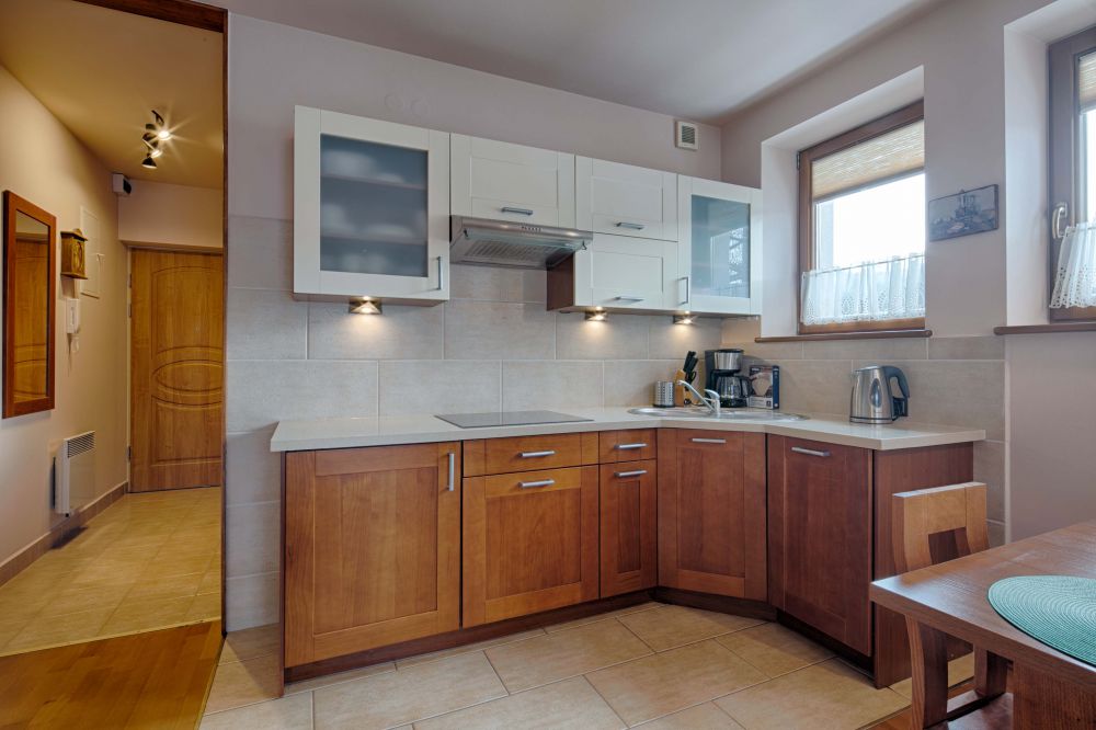 Aneks kuchenny: 1 komorowy zlew, płyta elektryczna (4-palnikowa), ekspres do kawy, czajnik elektryczny, zmywarka, naczynia, sztućce, garnki, zastawa szklana