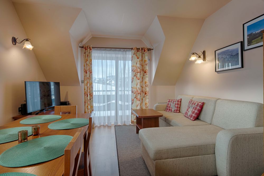 Salon: rozkładany 2-osobowy narożnik, TV LCD42', radio, stolik kawowy, wyjście na balkon