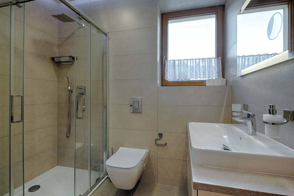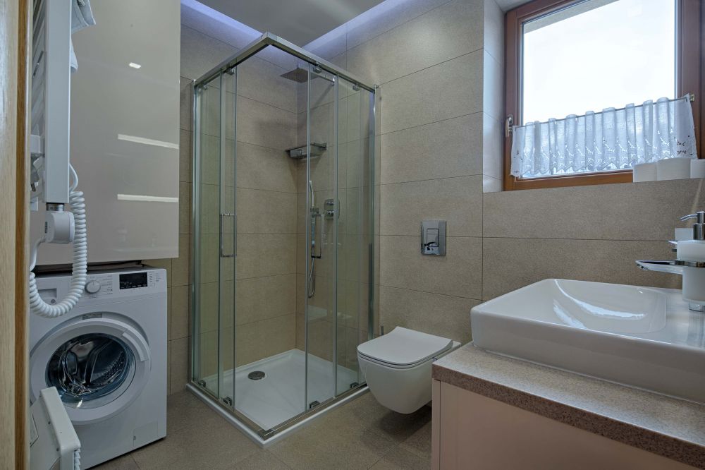 Łazienka: kabina prysznicowa, pralka, suszarka do włosów