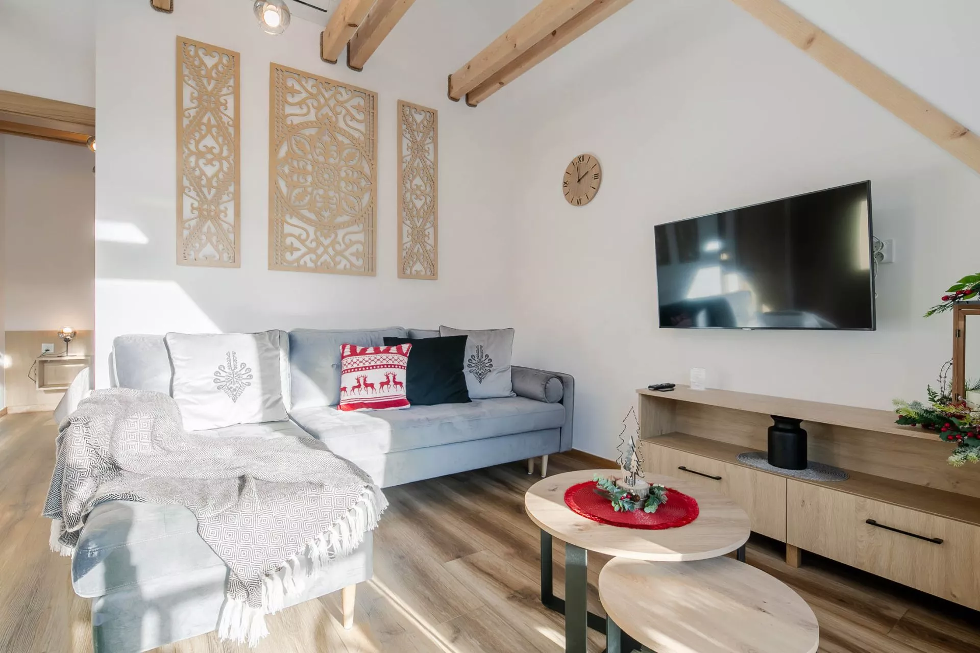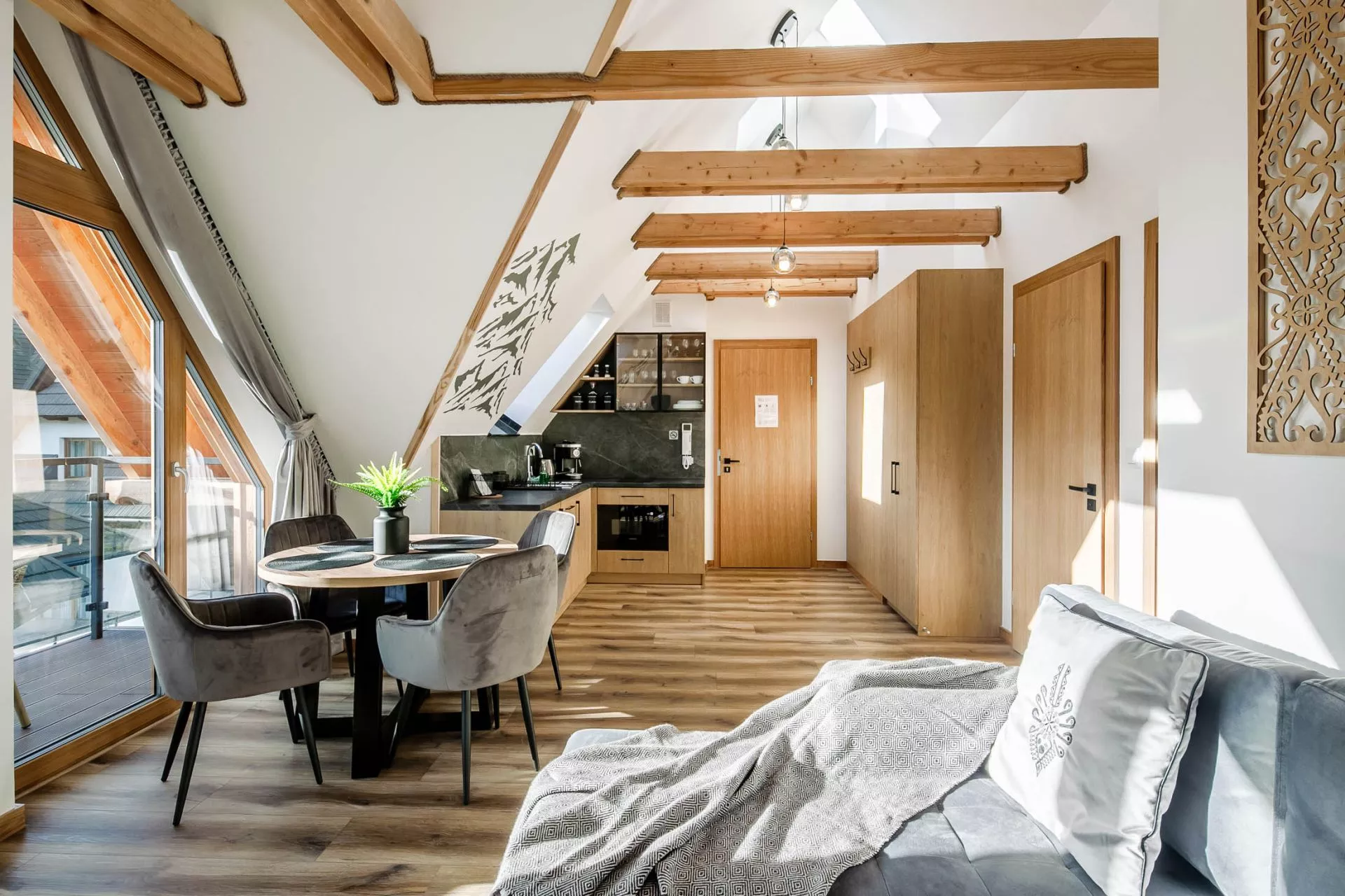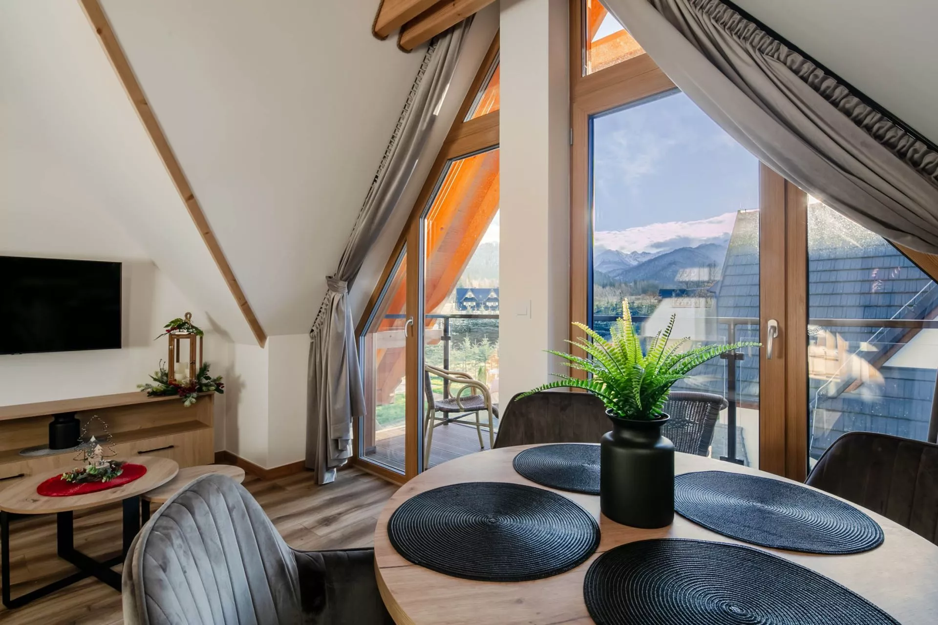 Salon - 2 osobowa rozkładana sofa, szafka typu rtv, TV'45, stolik kawowy, balkon z widokiem na Tatry z meblami ogrodowymi, okrągły stół i 4 krzesła, klimatyzacja.
