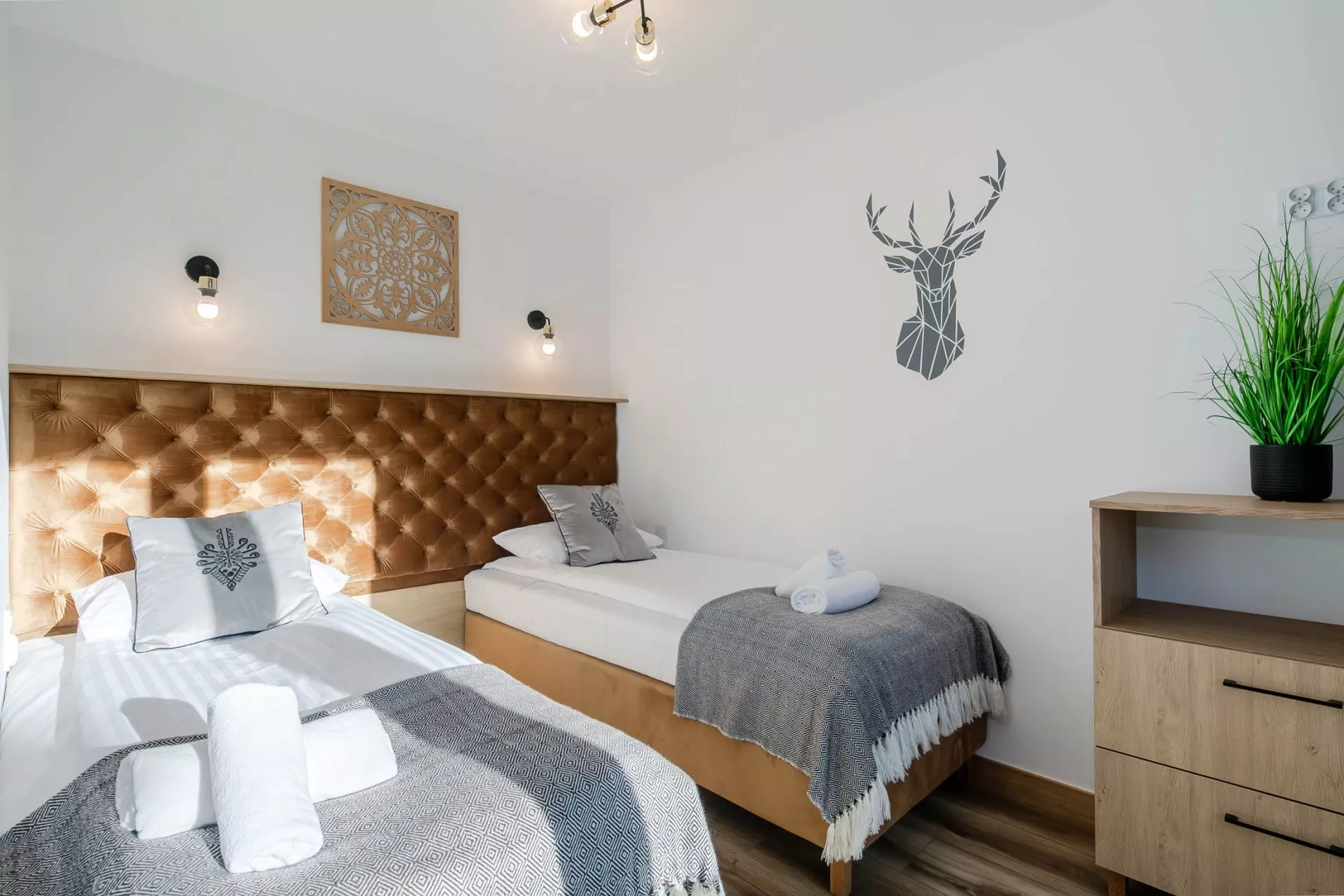 Sypialnia 1 - 2 łóżka pojedyncze, przy łóżku znajdują się gniazda elektrycznej, komoda, balkon z widokiem na Tatry