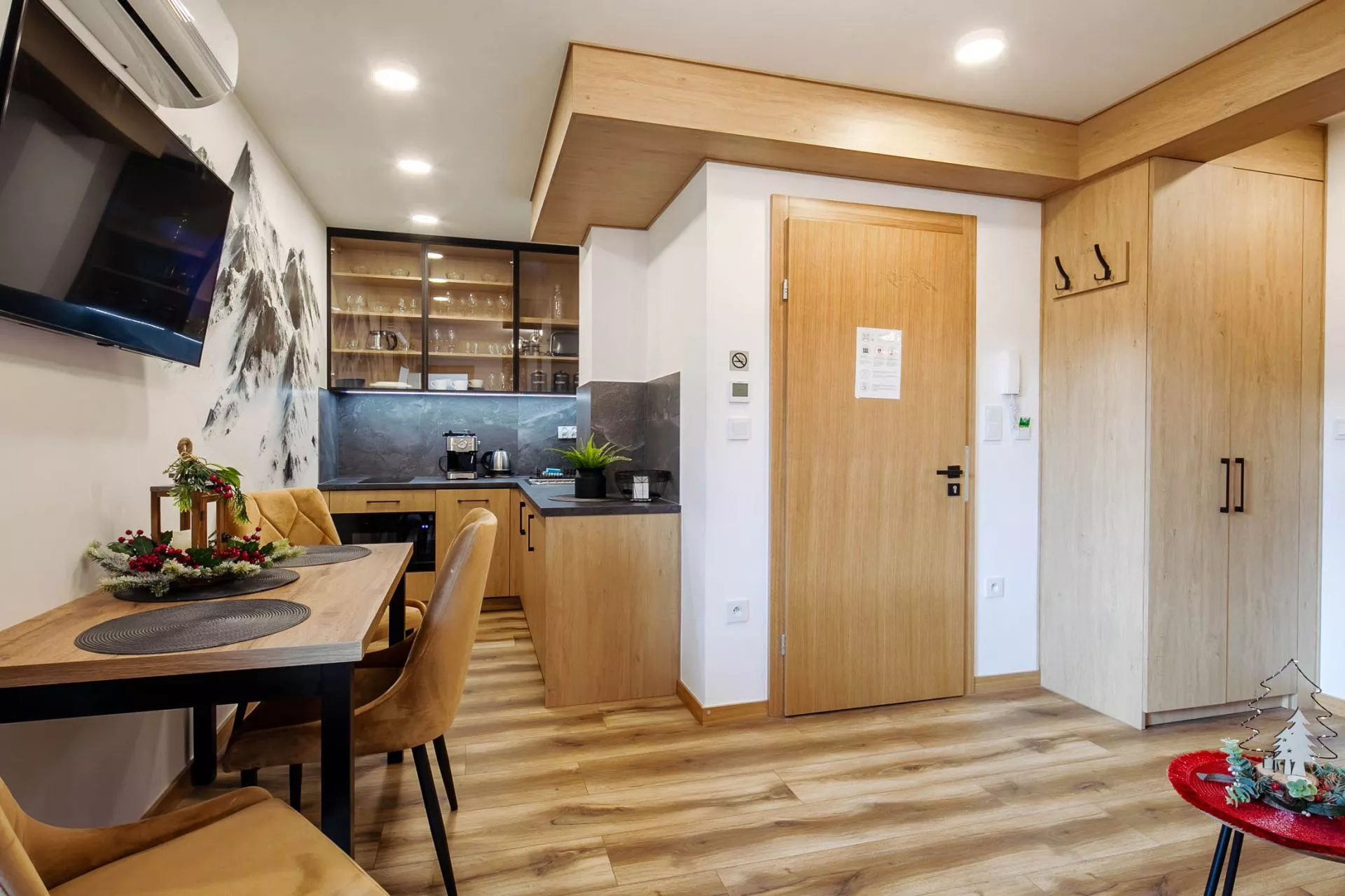 Salon: 2 osobowa rozkładana sofa, stolik kawowy, stół, 3 krzesła, TV'45, wyjście na balkon z pięknym widokiem na panoramę Tatr z meblami ogrodowymi, szafa, klimatyzacja.