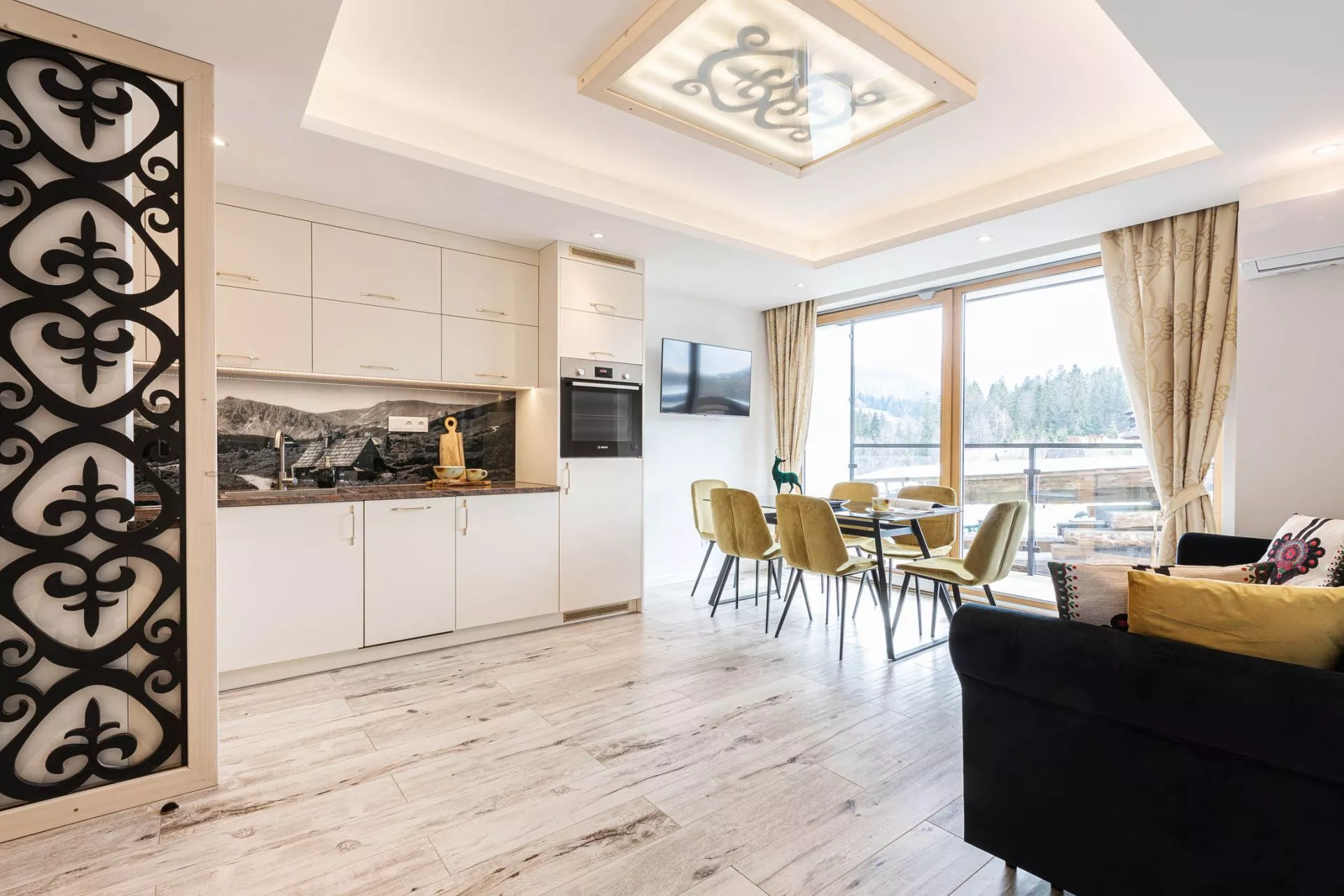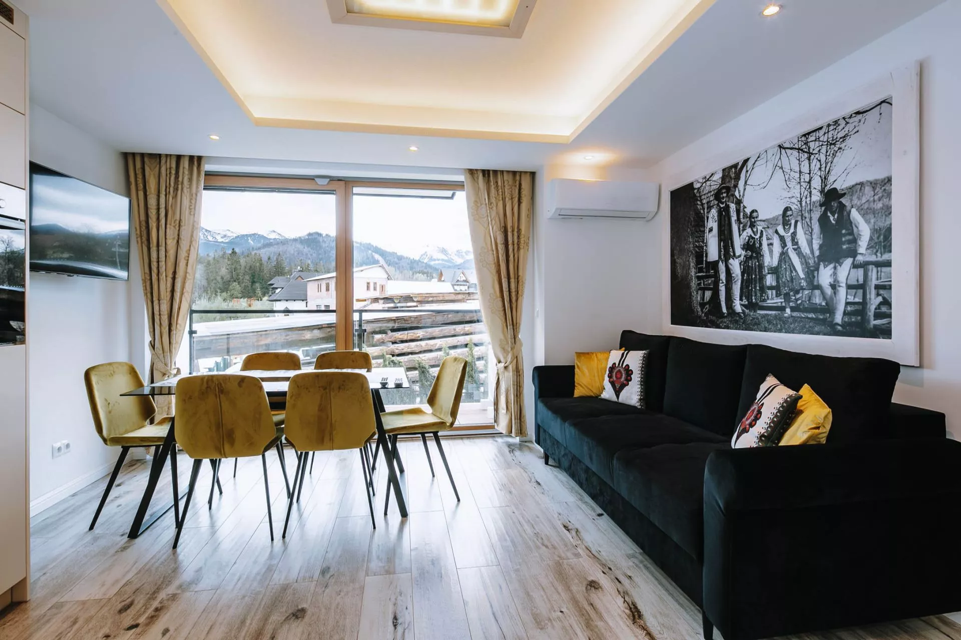 Salon: 2 osobowa rozkłada sofa, stół jadalniany, 6 krzeseł, TV'42, klimatyzacja. Z salonu znajduje się bezpośredni wyjście na 2 osobne balkony z których rozpościera się piękny widok na panoramę Tatr.